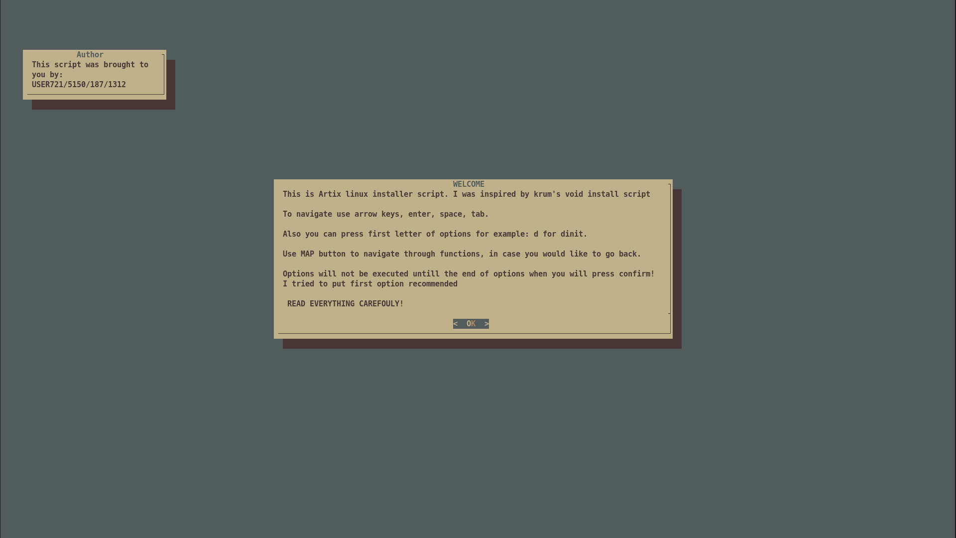 DIY KARMA KIT@lemmy.ml · edit-211 hours agoTUI Artix Linux Install scriptplus-squarelemmy.mlimagemessage-square1fedilinkarrow-up145arrow-down11
