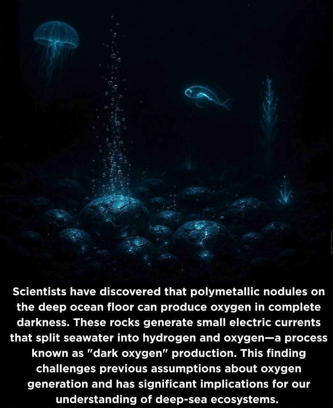 In the Clarion-Clipperton Zone, researchers found that polymetallic nodules-metal-rich rocks spread across the seafloor-may be creating oxygen in complete darkness. Acting like tiny natural batteries, these nodules split seawater into hydrogen and oxygen through electrochemical reactions, without sunlight or microbes.