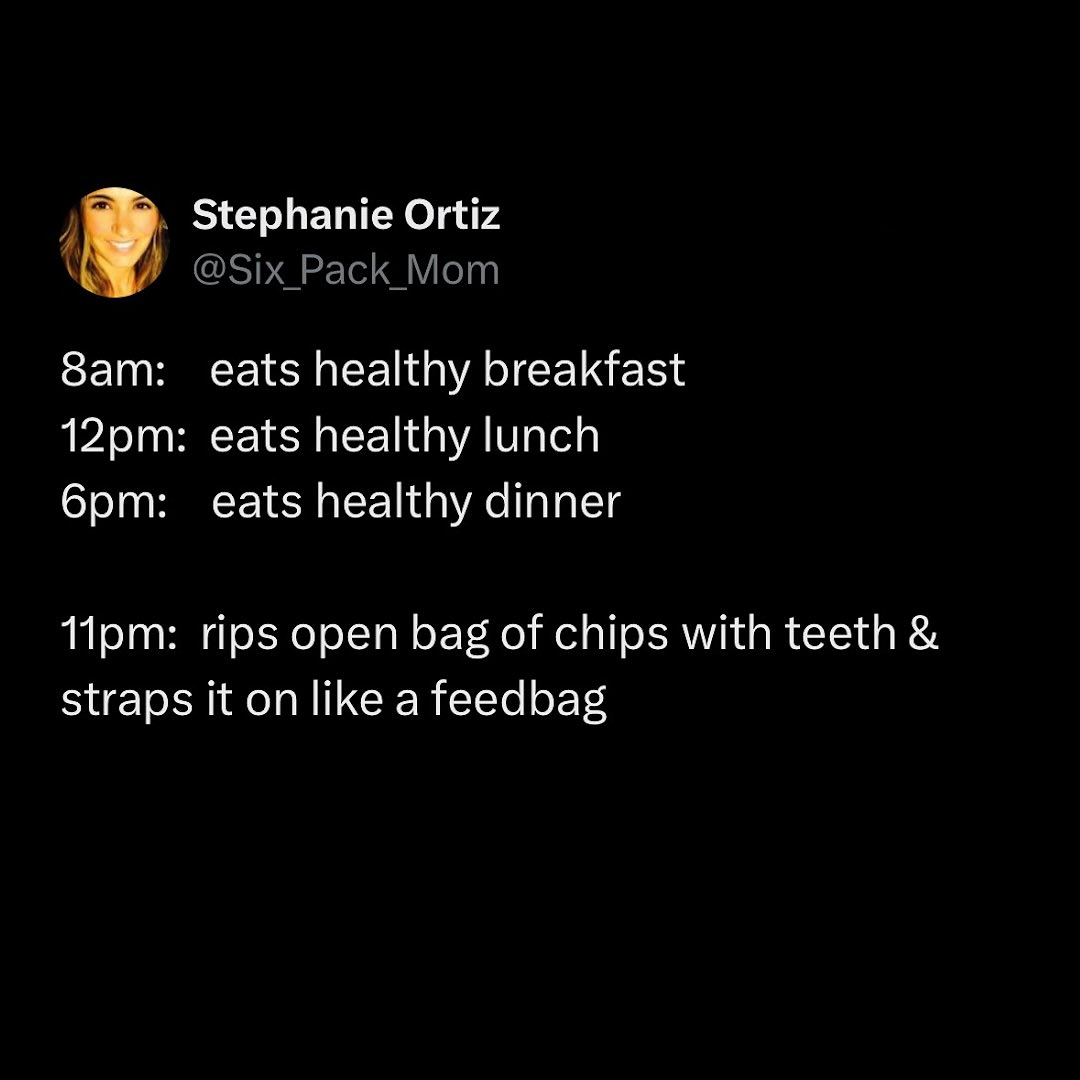 18:00 - eat some chips or chocolate, going for a walk23:00 - realizing I barely ate anything, completely losing control and dignity and digging through the fridge