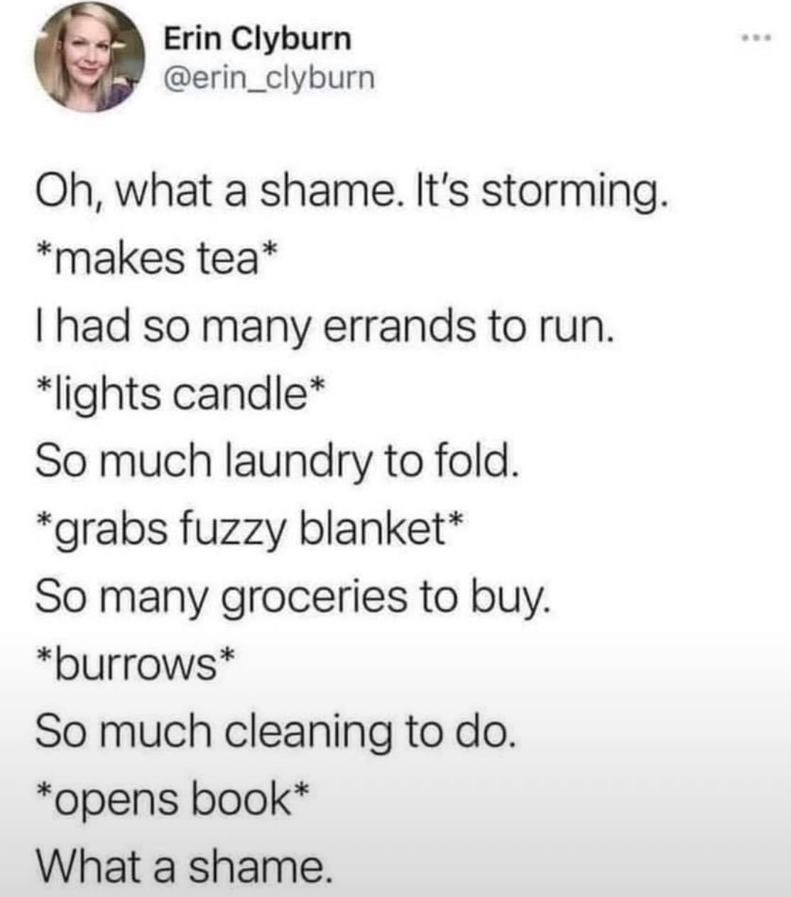 Fold the laundry and do the cleaning. How is rain stopping that?