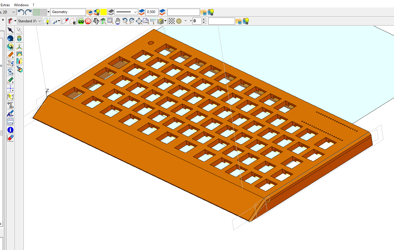 It has to go vertical and diagonal, but it fits on my stock-sized Ender 3 clone, even with a brim. Key layout, dimensions, placement of chamfers and the angles on the underside were all designed with this goal in mind. 30-hour print, if Cura is to be trusted. Going to start with a partial print to make sure the layer lines can handle the stress of the keyswitches being friction fit.